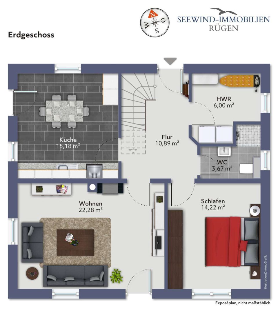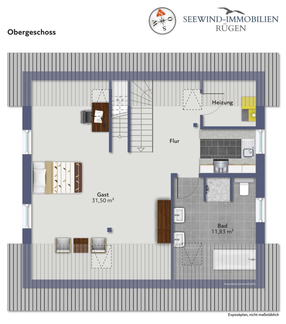 Durch eine massive Buchentreppe erreichen Sie das etwa 56m² große Obergeschoss. Ausgestattet mit einer zweiten Küche, und einem offenen Raum in dem Ihren Wohnträumen keine Grenzen gesetzt sind. Das einladende Badezimmer kann durch eine bodengleiche Dusche und eine Eckbadewanne zu einem echten Spa-Paradies werden – die Materialien für die Ergänzung sind bereits vorhanden. Überzeugend ist vor allem der unverbaubare Blick auf Sonnenuntergänge im Großen Jasmunder Bodden.