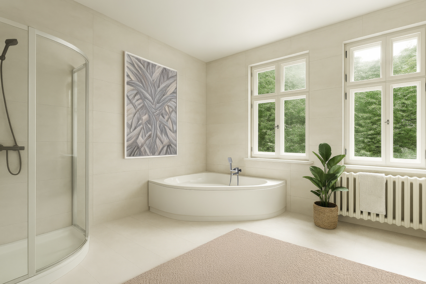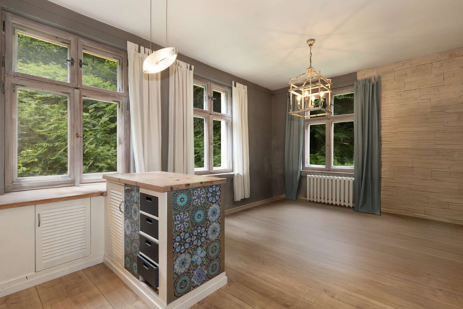 Die hier angebotene Wohnung umfasst ca. 133 m² Wohnfläche und begeistert durch Großzügigkeit, hohe Decken (mindestens 2,90 m) sowie lichtdurchflutete Räume mit einzigartigem Weitblick ins umliegende Grün. Naturbelassene Holzfenster holen den Wald ins Haus, während gespachtelte Wände im Loft-Stil, massive Holztüren und Natursteinakzente eine individuelle Handschrift hinterlassen. Die große Wohnküche mit angrenzendem Essbereich bietet den idealen Rahmen für gesellige Abende oder ruhige Stunden mit Blick in die Natur. Das stilvolle Tageslichtbad mit Eckbadewanne, Dusche und Fußbodenheizung ist ein Ort der Entspannung. Die moderne Brennwerttherme aus dem Jahr 2021 sorgt effizient und zuverlässig für die Beheizung und Warmwasserversorgung der Wohnung.