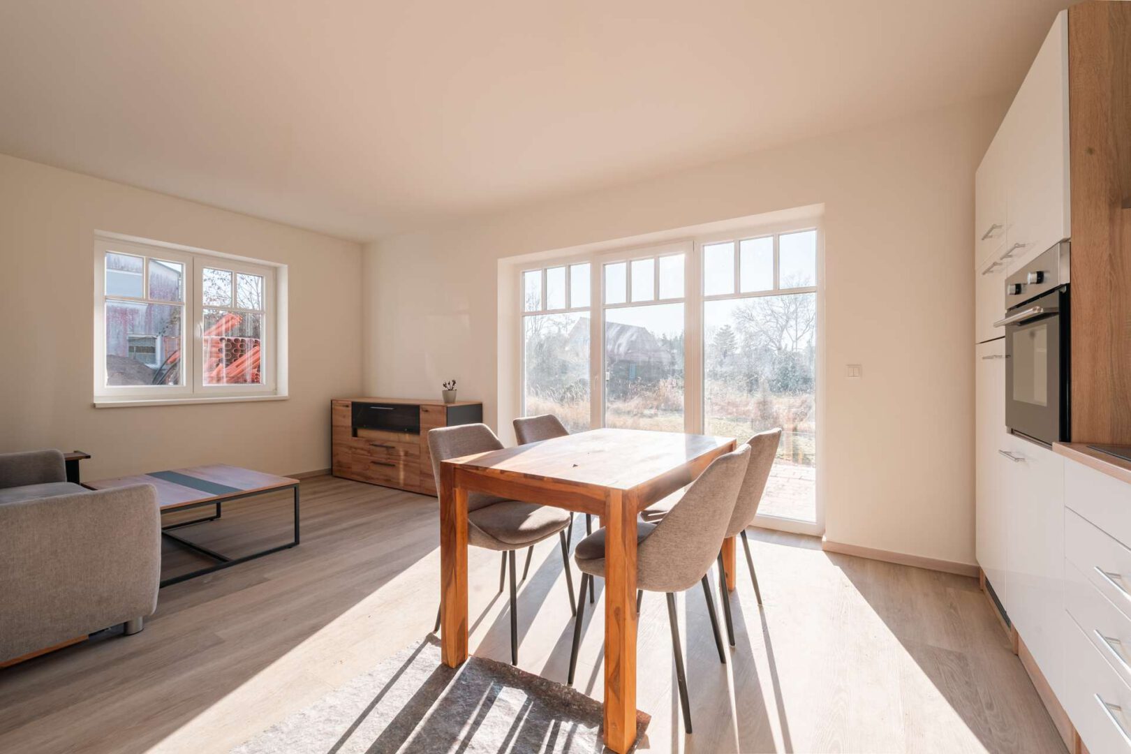 Der offen gestaltete Wohn- und Kochbereich bildet das Herzstück der Wohnung. Großzügige Fensterflächen lassen viel Tageslicht herein und schaffen eine freundliche, offene Atmosphäre. Von hier aus gelangen Sie direkt auf die sonnige Terrasse mit Südausrichtung – ein echter Mehrwert, der lange Sonnenstunden verspricht. Ob Frühstück im Freien, entspanntes Lesen oder ein Glas Wein am Abend: Hier genießen Sie Licht, Wärme und Ruhe gleichermaßen.