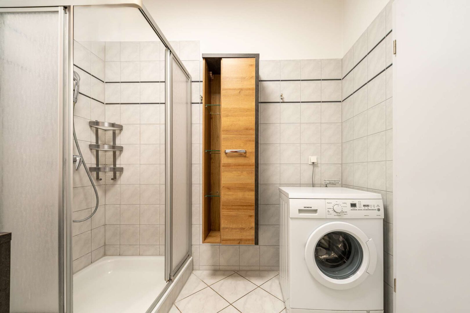 Zwei separate Schlafzimmer bieten gute Rückzugsmöglichkeiten. Das modern geflieste Bad ist mit Dusche sowie einem Waschmaschinenanschluss ausgestattet und ergänzt die Wohnung funktional.